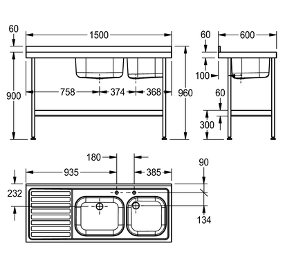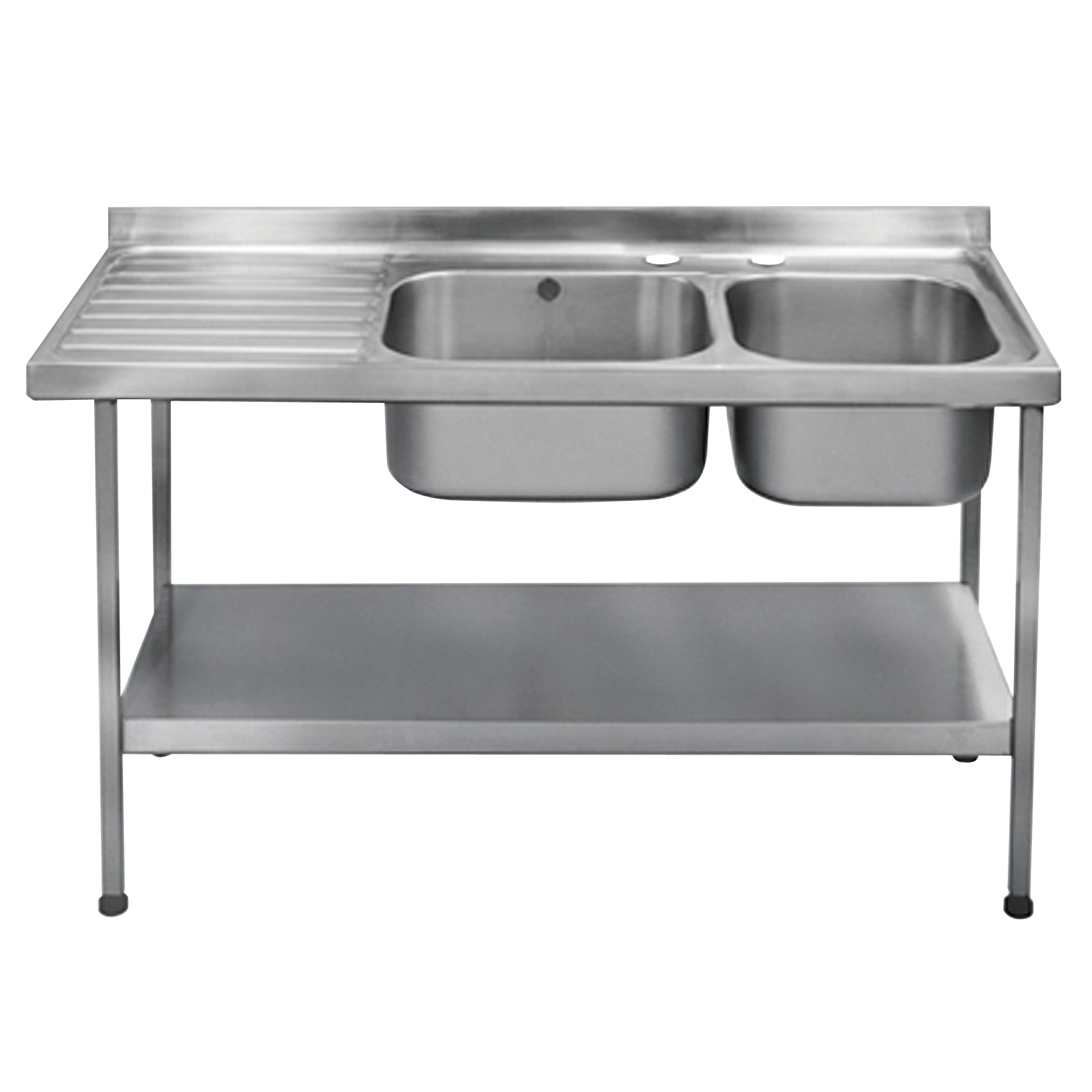Mini catering sink 1500mm x 600mm with double bowl and left hand drainer. Manufactured from 1.2mm thick, grade 1.4301 (304) stainless steel, with a satin finish. Designed with tap holes drilled for mixer taps only. An earthing lug is fitted under the drainer. Stainless steel underframes and shelf (sold separately) are supplied in a flat pack form with easy to read assembly instructions. Each leg is fitted with an adjustable foot (-20, +10mm) with a working height of 900mm. The sink is supplied with a 38mm waste, plug, chain and overflow.
