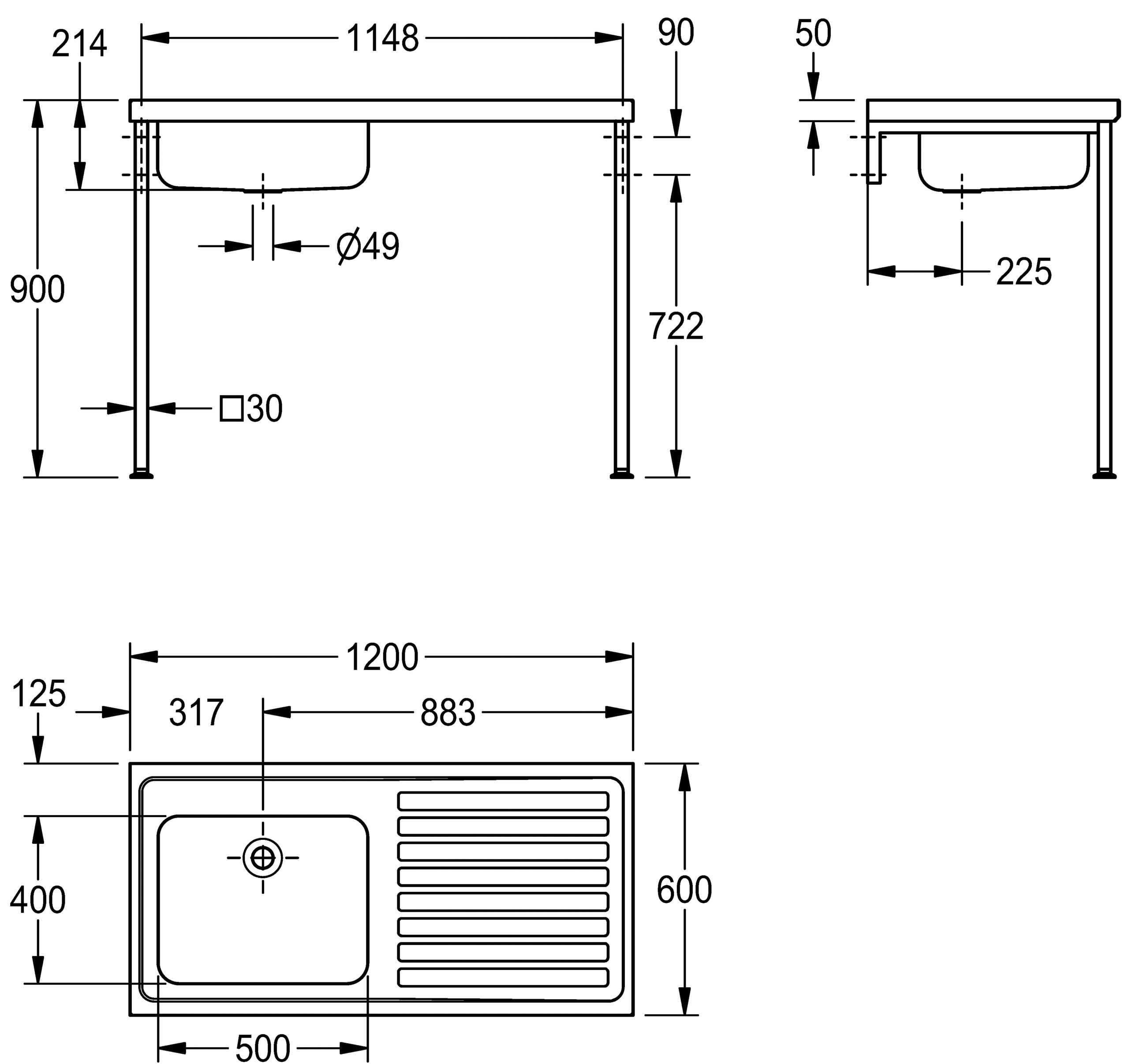 A single bowl/single drainer sink manufactured from 1.2mm thick, grade 1.4301 (304) stainless steel, satin polish finish. This sink top is turned down on all four edges and incorporates a wet area recess. The bowl is prepared for a 38mm waste outlet.