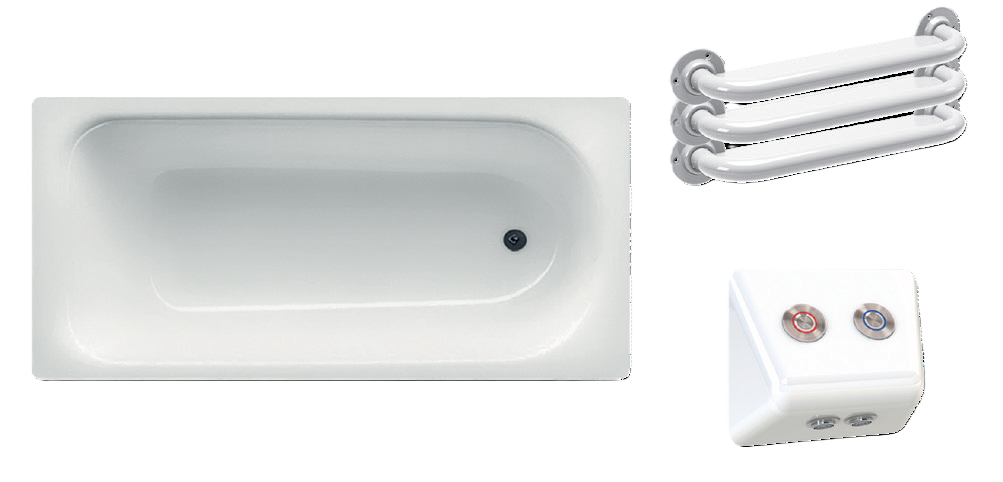 Accessible bath pack in stainless steel supplied with: white enamelled steel bath, high-security bath filling backplate with hot and cold tactile sensors, bath control system mains operated, anti-microbial valve, thermal disinfection valve, TMV3 thermostatic mixing valve and white steel grab rails. Manufactured in accordance with HBN 00-10, Part C Standards.