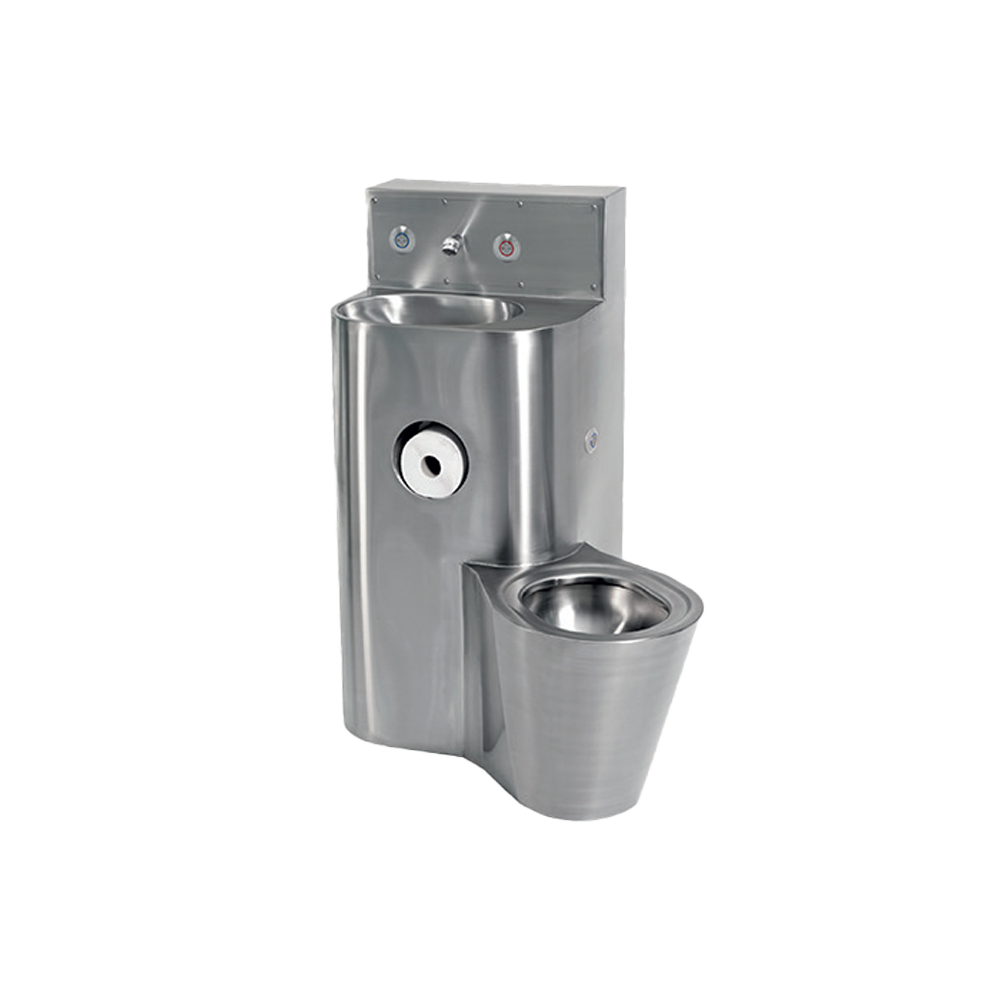 Chromium nickel steel toilet and sink combination unit, satin finish surface, for installing against a wall, with integrated electronic tap components. Invisible fixing with grub screws, lockable inspection opening Mounting stand, material thickness 2 mm with elevated rear wall including wall outlet and tactile switch with start/stop function with seamless welded toilet paper roll compartment and seamless moulded wash basin with plastic trap. WC pan, material thickness 1.6 mm with full-length skirting, arranged on the right 45 degrees, concealed bowl, tactile switch for WC flushing, flushing certified pursuant to EN 997, horizontal outlet at the back DN 100. With solenoid to connect to premixed hot water or cold water. Condensation water-proof concealed cistern with single flush technology (9 or 6 litres) Supply voltage 24 V DC Including fixing material.