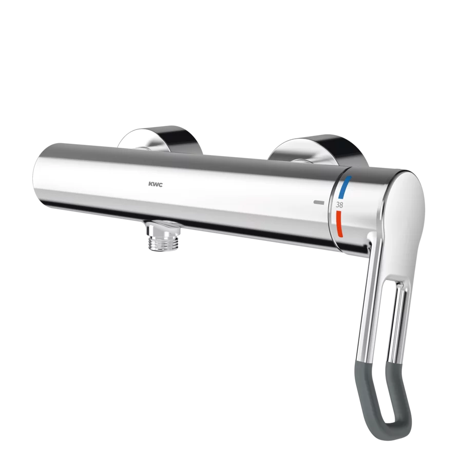 F4LT-Med thermostatic single lever mixer as DN 15 wall-mounted mixer for wall mounting, for shower facilities in the healthcare and nursing sectors.