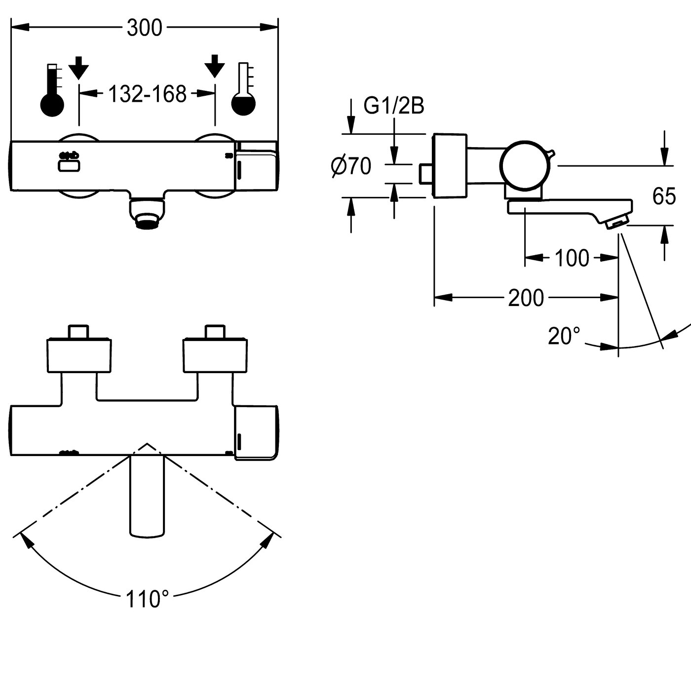 F5E-Therm thermostatic mixer DN 15 for wall mounting with lockable swivelling outlet, for sanitary facilities. Opto-electronic control, activation on hand reflection. Thermostat with metal handle with adjustable, turn-proof temperature stop With the option of manual thermal disinfection. For connection to hot and cold water. Control electronics, solenoid valve cartridge, 6 V lithium battery (CR-P2) and sensor in all-metal housing, polished chromium-plated brass. Laminar jet controller with integrated flow rate controller 6.0 l/min. With adjustable and lockable connections with backflow preventers and strainers, fully covered by depth-adjustable screw rosettes. 200 mm projection.