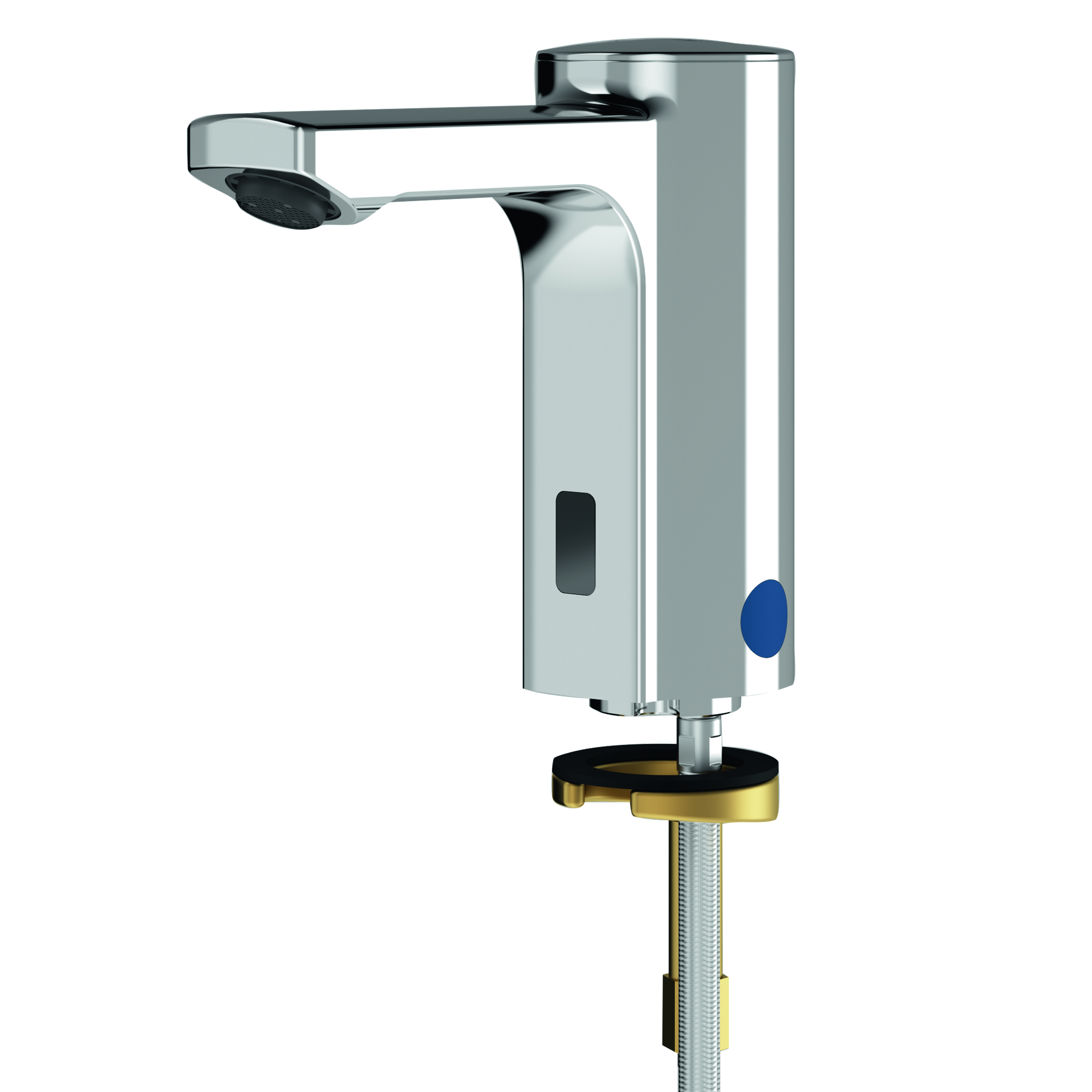 F5E-Mix electronic pre-mixed pillar tap. For connection to pre-mixed hot or cold water via hose and strainer. Control electronics, solenoid valve cartridge, 6 V lithium battery (CR-P2) and sensor in all-metal housing, high-polished chromium-plated brass. Anti-theft aerator, design SLIM, with integrated flow regulator 5.0 l/min. Activated water hygiene flushing 24 hours after last activation, safety switch-off with continuous reflection and saving of statistical data. If you require additional functionality, such as sensor range adjustment and tap run time, a bi-directional remote is available as an extra.