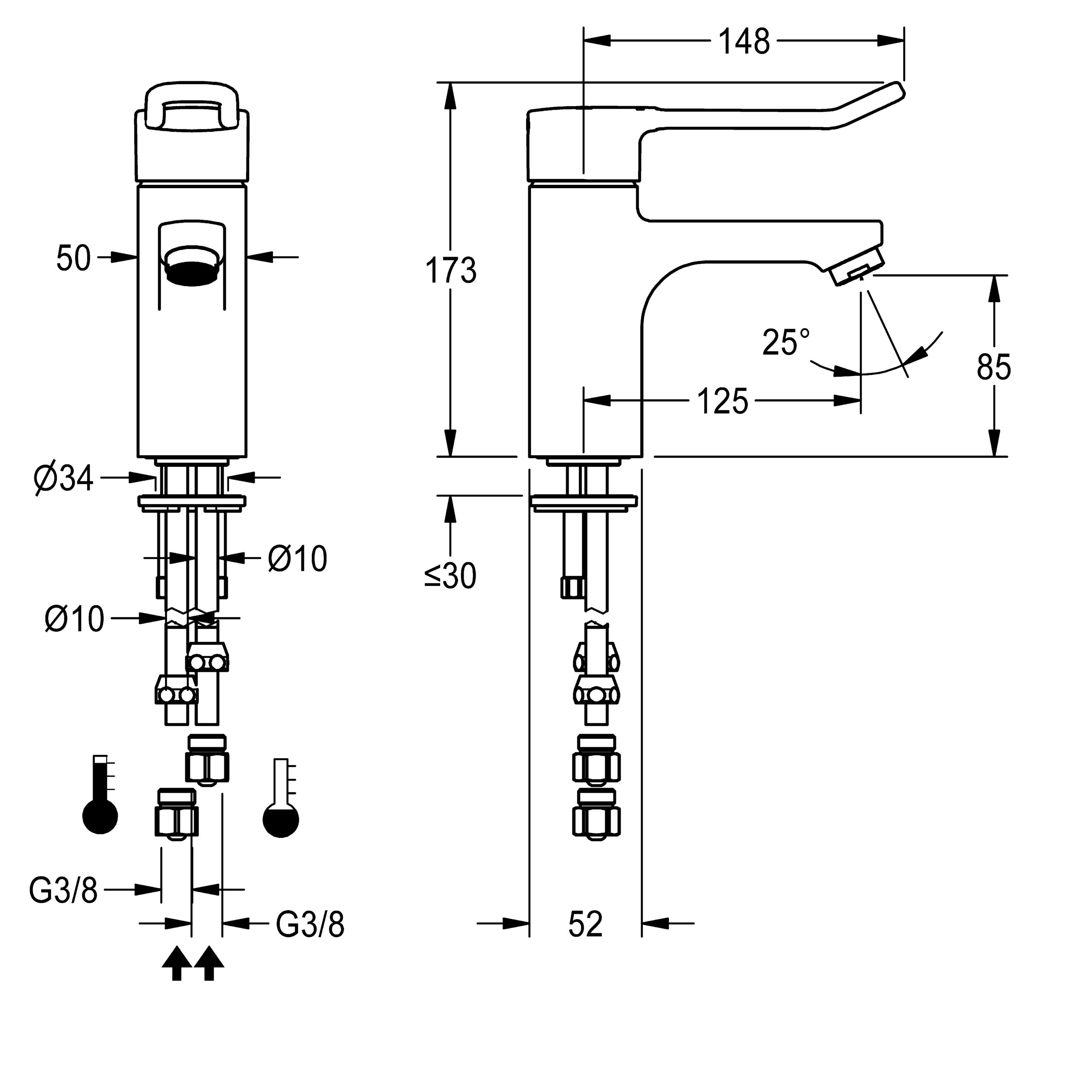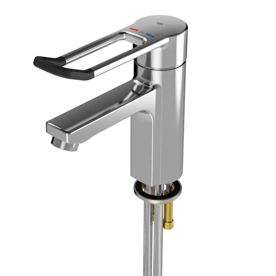 F5L-Therm thermostatic single-lever mixer as DN 15 pillar mixer for accessible sanitary facilities, lever length 150 mm. Thermostatically-controlled mixer cartridge with expansion element and active scald protection as well as adjustable and turn-proof temperature stop, and ceramic disc technology. With mechanism for optional hygiene unit for automatic hygiene flushing and program-controlled thermal disinfection and storage of statistical data. Lever cap in ergonomic bracket design, with slight curvature in the front and basalt-grey coating, in line with two-senses principle (tactile and visual).