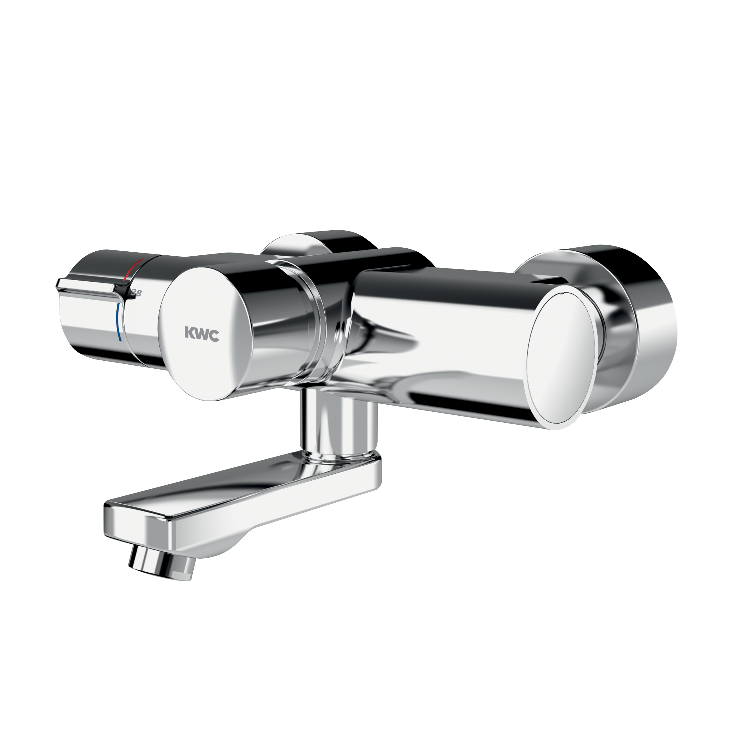 F5S-Therm self-closing thermostatic mixer DN 15 for wall mounting with lockable swivelling outlet, for sanitary facilities. Hydraulically controlled, connects to hot water and cold water. With mechanism for optional hygiene unit with C-module for automatic hygiene flushing and readout of statistical data. FRAMIC self-closing cartridge, hydraulically controlled, low maintenance and stagnation free, with ceramic disc technology, self closing, flow pressure independent due to medium-independent design. Fully adjustable flow duration. Thermostat with metal handle with adjustable and turn-proof temperature stop, with option for performance of manual thermal disinfection. Scald-protected, safe-touch housing, all-metal construction, polished chromium-plated brass. Laminar jet controller with integrated flow rate controller 6.0 l/min. With adjustable and lockable connections with backflow preventers and strainers, fully covered by depth-adjustable screw rosettes. Projection 135 mm.