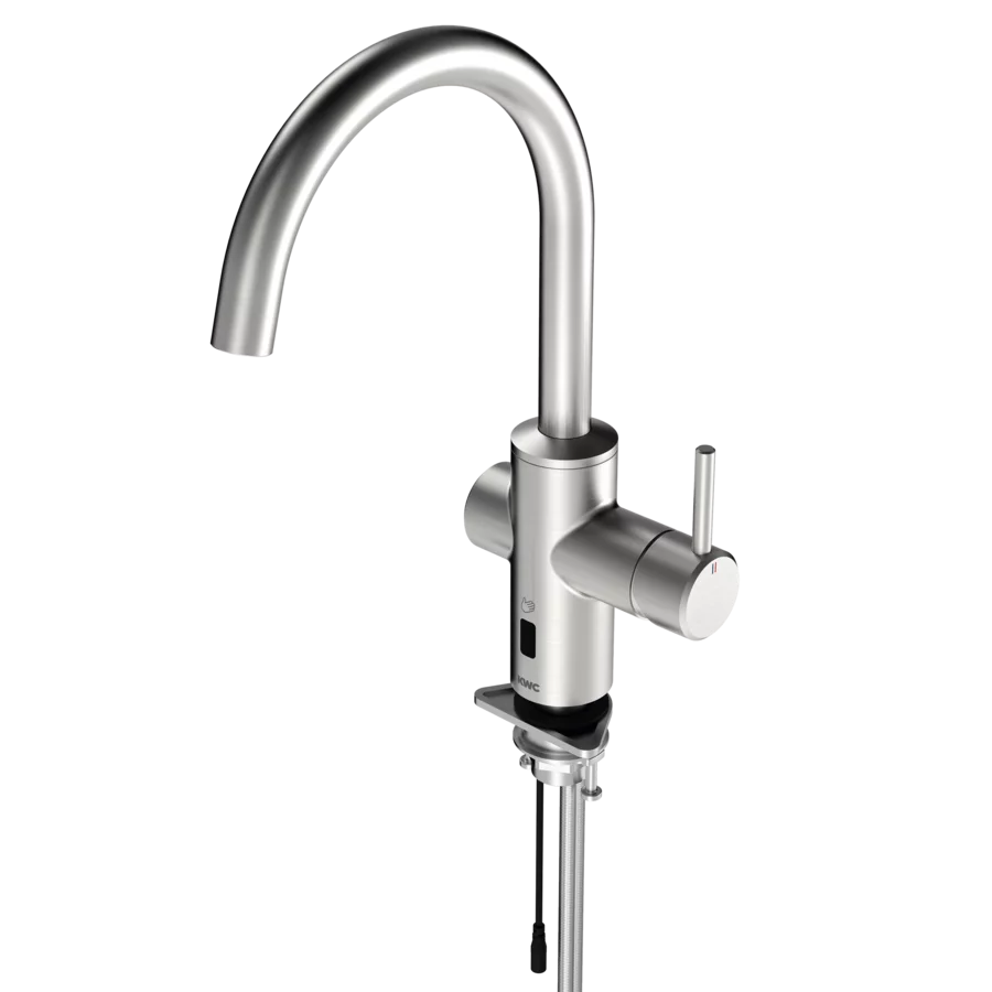F5LME hybrid kitchen fitting DN 15 as pillar mixer with swivelling spout, can be locked in the centre position. Adjustable swivel ranges of 50°, 120° and 360°. For connection to hot water and cold water via hoses with strainers. Single lever mixer with mixer cartridge with ceramic disc technology and adjustable, turn-proof temperature stop. Alternative activation using hand reflection via an opto-electronic sensor for time-controlled water release with pre-set mixing water temperature.