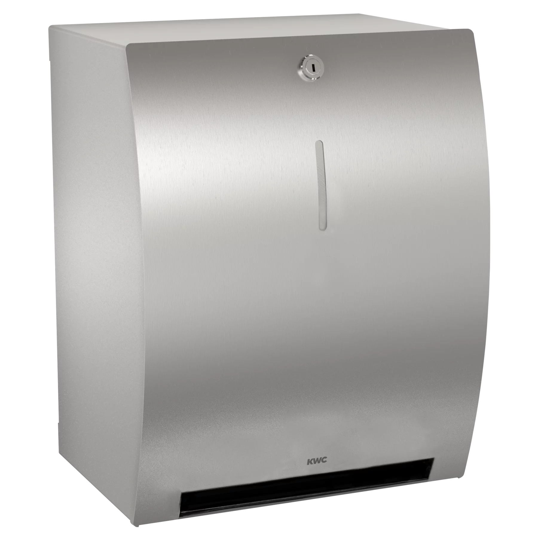 Manual paper towel dispenser for wall mounting, stainless steel, surface satin finished, material thickness 1.5 mm, curved front with inspection window, cylinder lock with KWC standard key, capacity 1 paper roll, paper comes automatically out to pull with hand, maintenance free mechanic, electrical connection or batteries are not required, easy paper roll change mechanism, for rolls with max. width 205 mm and max. diameter 200 mm, paper length is not adjustable – one length 260 mm, includes stainless steel screws and dowels.