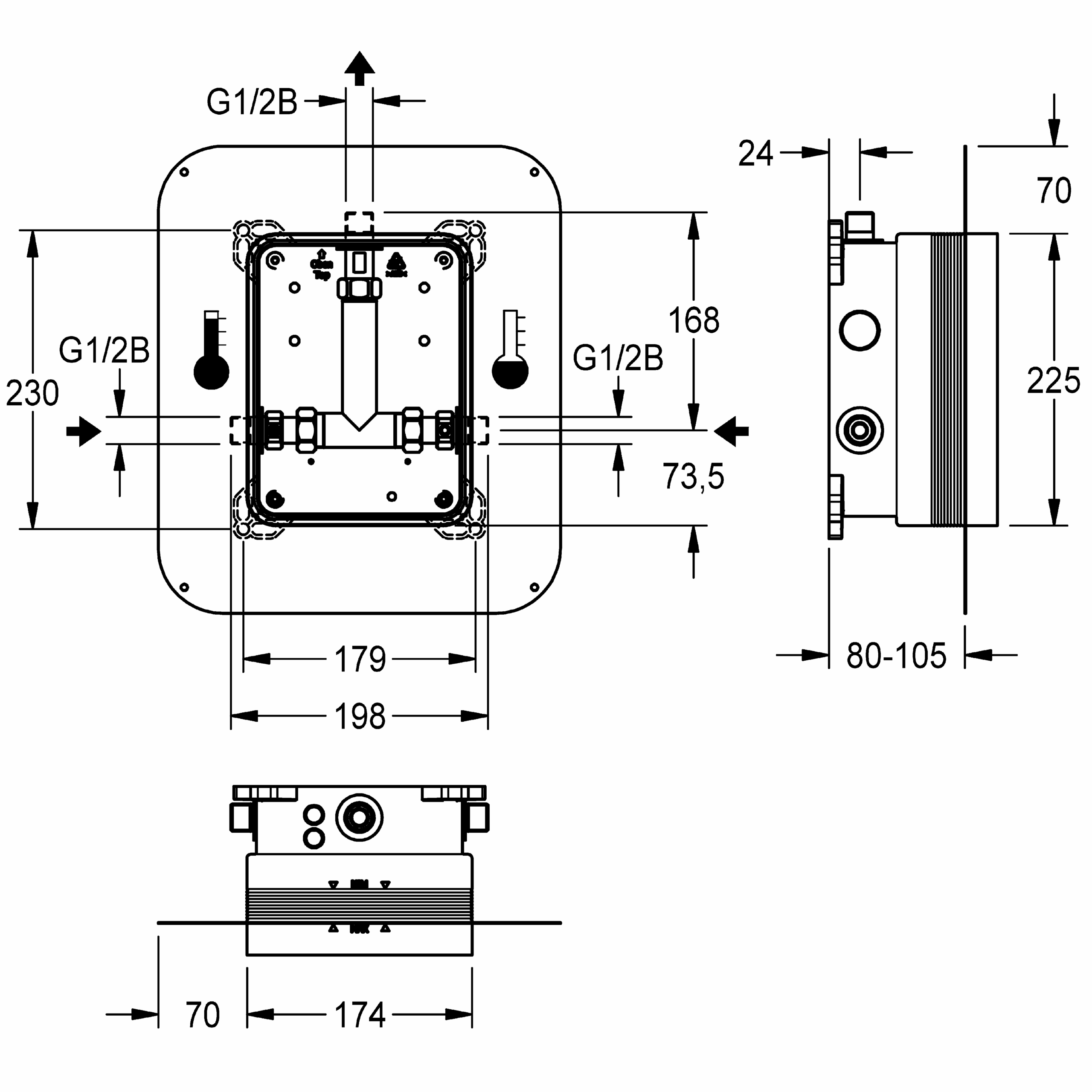 R5 basic installation kit with sliding adhesive flange for in-wall mounting of finished installation kits DN 15 with mixing unit, for shower facilities. For connection to hot and cold water. KWC system box made of plastic, 174 x 225 mm, with lockable connection screws, shell protection, flush connector for flushing and leak test. Continuously-adjustable sliding adhesive flange with form-closed, flexible, 70 mm wide sealing collar. Sealing collar made of water-tight, permanently-elastic, alkali-resistant, and crack-bridging thermoplastic elastomer with polypropylene fleece for connecting to compound seals in dry and wet construction.