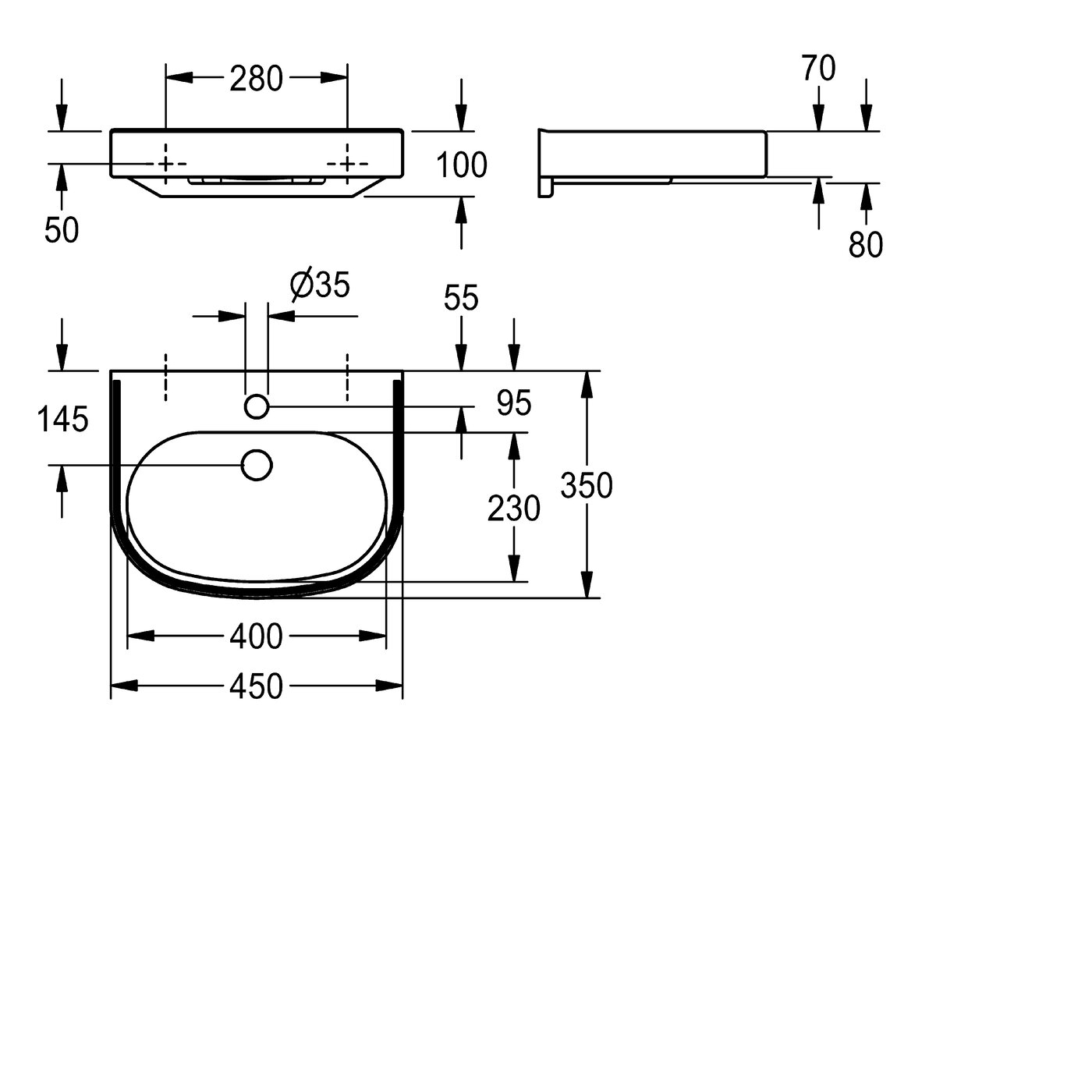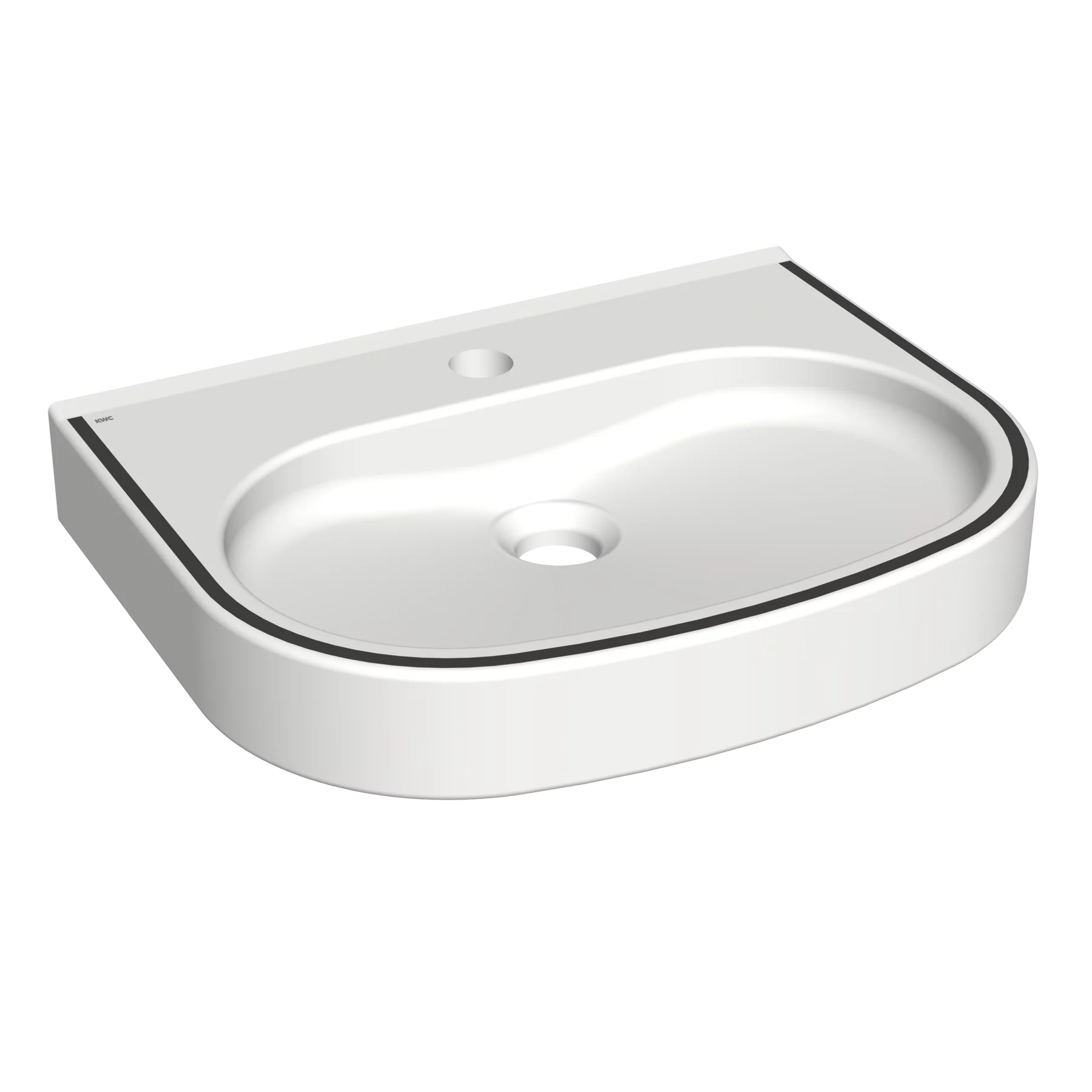 VARIUScare single wash basin made of MIRANIT resin-bonded mineral material. Colour Alpine white with colour strip (RAL 7022). Wheelchair accessible, with integrated gripping edge. Seamless moulded bowl, without overflow. With tap hole. Mounting on washbasin back panel. Rear contoured edge. Mounting material included.
