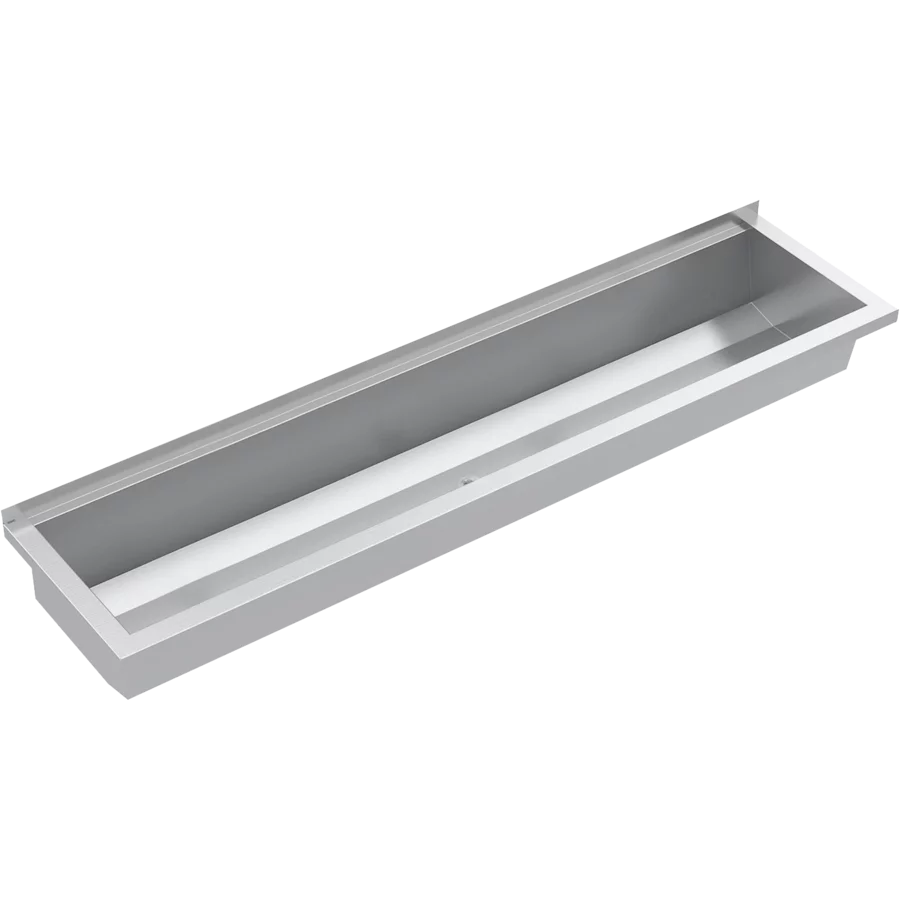 Planox seamless welded washtrough for wall mounting, chromium nickel steel, satin finished surface, material thickness of washtrough 0.8 mm / side panels 1.2mm, side panels with integrated wall brackets, without tap ledge or overflow, 40 mm rear upstand, central waste. Supplied with 38mm dome waste and mounting materials. Optional shroud, splashback and supporting frames are available as extras.